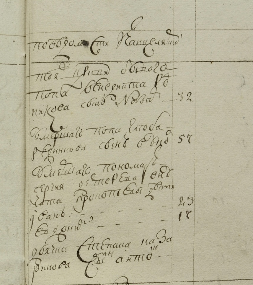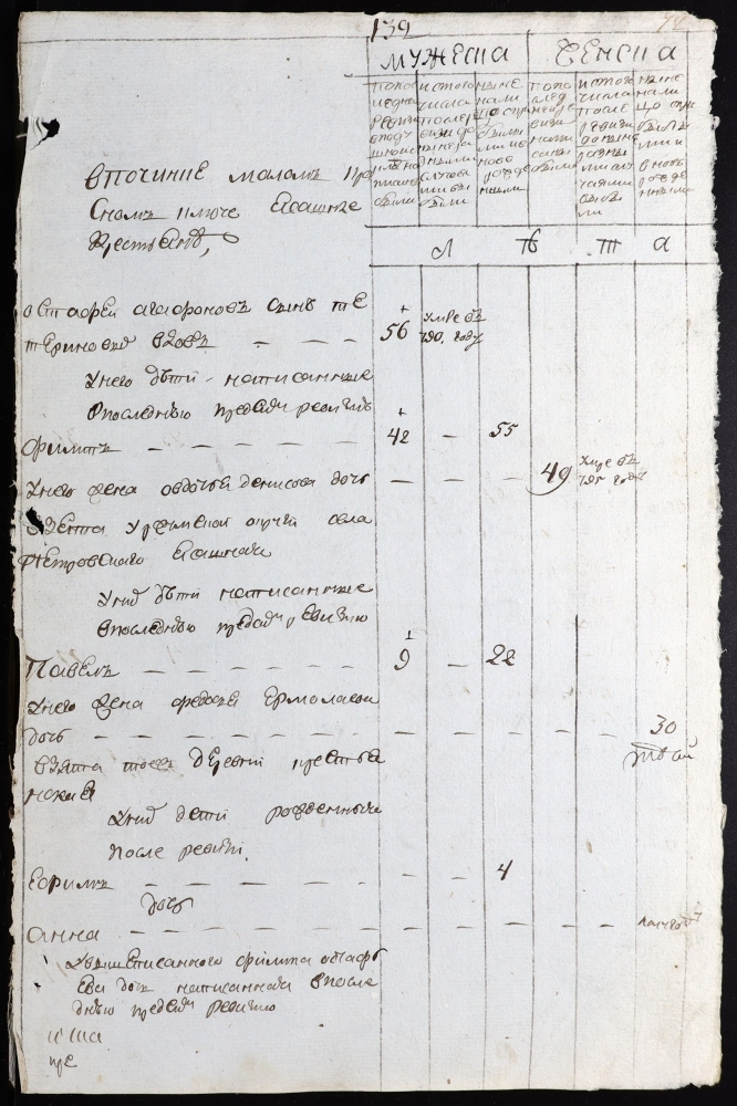 И всего в д.Малкове, в д.Крюкове, в починке Чепаеве Ключище, в д.Заполской, что над Сиком речкою, в д.Колубаеве, в д.Толоеве, в д.Попове, в д.Новокрещенской, в д.Дюкове Полянке, итого: в 9 деревнях и с починком 54 двора; крестьян в них: 56 человек; у них детей: 117 человек; внучат: 5 человек; братьи родные: 7 человек, а у них детей: 8 человек, 1 человек племянник, у него 1 человек сын; всего: крестьян и их детей и внучат и братьи родные и их детей с племянником и с его сыном 195 человек. А в сыску 13 человек крестьян сказали: тех де деревень и починков крестьяне поселились в черном лесу и росчищали тот лес они, крестьяня...