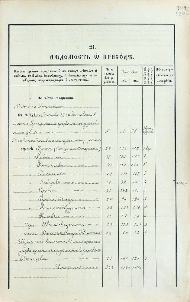 С архивной полки. "Ведомость о приходе" была в каждой клировой ведомости, наряду со сведениями о церкви и церковном причте. В первых "ведомостях" первоначально публиковались общие цифры с указанием всех дворов и жителей по приходу. Примерно с 1830-х годов стали публиковаться сведения о каждой деревне, с указанием жителей и дворов, а также по сословиям и вероисповеданию (указывались православные, старообрядцы и некрещеные). В архиве ЦГАКО такие "ведомости" сохранились ежегодно по каждому приходу с 1830-х годов по 1915 год. При работе с ними обнаруживаются разночтения с предыдущими годами (например, меньшее число жителей, чем было прежде) и с мирскими документами. При этом нужно отметить, что церковные документы были более точны, чем светские...