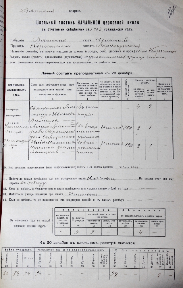 С архивной полки. "Школьный листок" церковно-приходской школы села Коркино Нолинского уезда. 1903 год. Такие документальные отчеты ежегодно заводились на каждую церковно-приходскую школу. Здесь приводились сведения о школе, об учителях (с указанием зарплаты) и о учениках. В конце документа стоят подписи заведующего школой и учителей... ЦГАКО ф.822 оп.1 д.208 лл.38-38 об