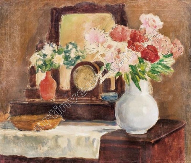 На репродукции одна из работ художника: Натюрморт с зеркалом и часами