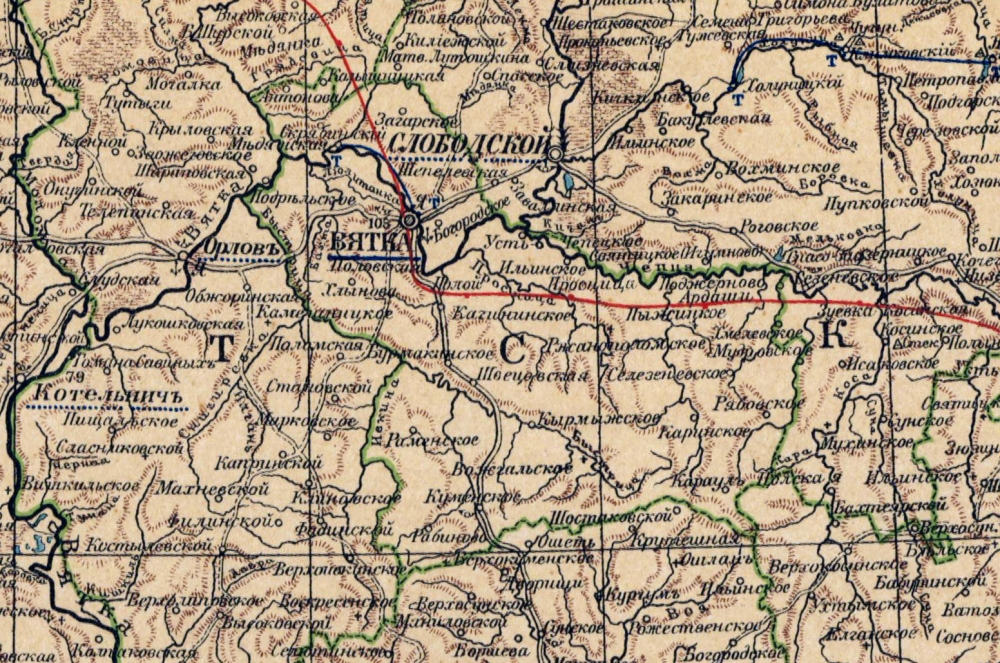 Иллюстрация: часть карты Вятского уезда. На ней отмечены только крупные села. Такое мелкое село, как Красное с 4 дворами, не сочли нужным даже указать...