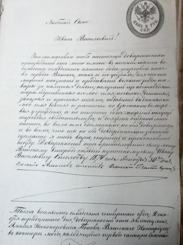Примерно в 1870-е годы купец Столбов окончательно перебрался в Вятку и стал заниматься другой торговлей. В «Ведомости о поверке торговых заведений по г.Вятке» за 1875 г. упоминается две его лавки «с чаем, сахаром и кофе в лавках Спасского собора на нижней торговой площади». Заведовал лавкой по особой доверенности 1874 года сын его Иван, помогал ему приказчик-крестьянин. Впоследствии эта лавка и перешла к Ивану Васильевичу. По всей видимости, в ней и начинал свою работу Митрофан Кузьмич. 10 декабря 1876 года отец семейства отставил эту землю в возрасте 65 лет. Незадолго до этого, в 1875 г. он оформил документ с правом передачи торговли на имена брата Алексея и сына Ивана35, а в 1876 г. – особую доверенность на последнего36. В «Ведомости городской управы о купцах и выданных им на 1876 г. свидетельствах» Василий Алексеевич уже упомянут как «почетный гражданин купец 1й гильдии». Вот такое стремительное продвижение вверх этот купец прошел в торговой среде – из третьей гильдии в первую…
