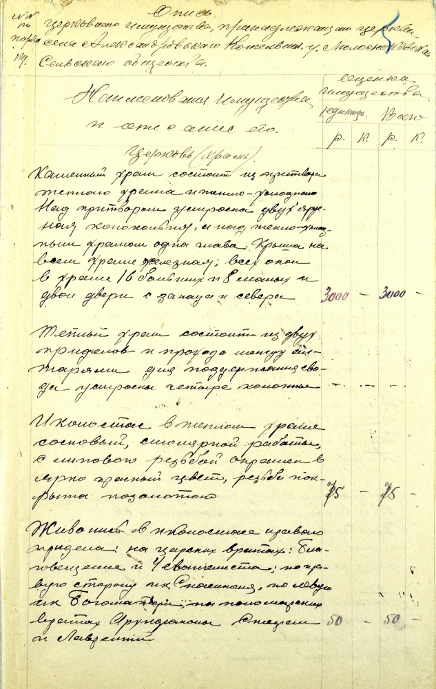 Опись имущества (включая недвижимость) церкви села Александровского Котельничского района 1920-х годов (ЦГАКО ф.Р-1258 оп.1 д.141 л.5). Подобные описания очень информативны (а они есть практически по каждому храму Кировской области): здесь и описание церкви, и иконостасов (с перечислением икон), перечисление колоколов с указанием веса, драгоценностей, описание недвижимости. Подробно также описывались все иконы и разные мелкие предметы, вплоть до последней кочерги...