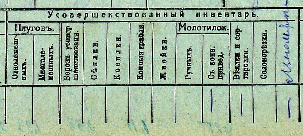 На скане: в большинстве в переписи в графе по технике было пустое место, в лучшем случае 1 или 2 молотилки на всю деревню; остальное и плуги были большой роскошью и редкостью...